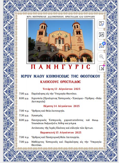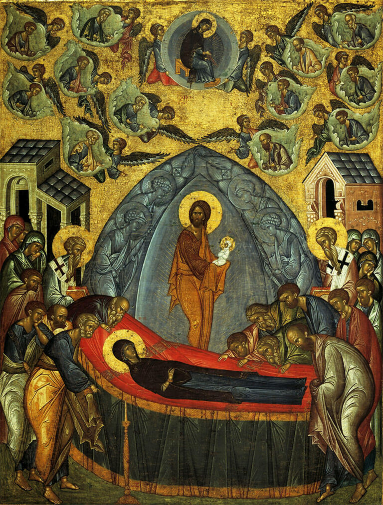 Τόν Αὔγουστο ἡ Ἐκκλησία ἑορτάζει τό τέλος τῆς ἐπίγειας ζωῆς τῆς Παναγίας, τό θάνατό της, γνωστό ὡς Κοίμηση, μιά λέξη ὅπου τό ὄνειρο, ἡ μακαριότητα, ἡ εἰρήνη,ἡ ἠρεμία καί ἡ χαρά ἑνώνονται.