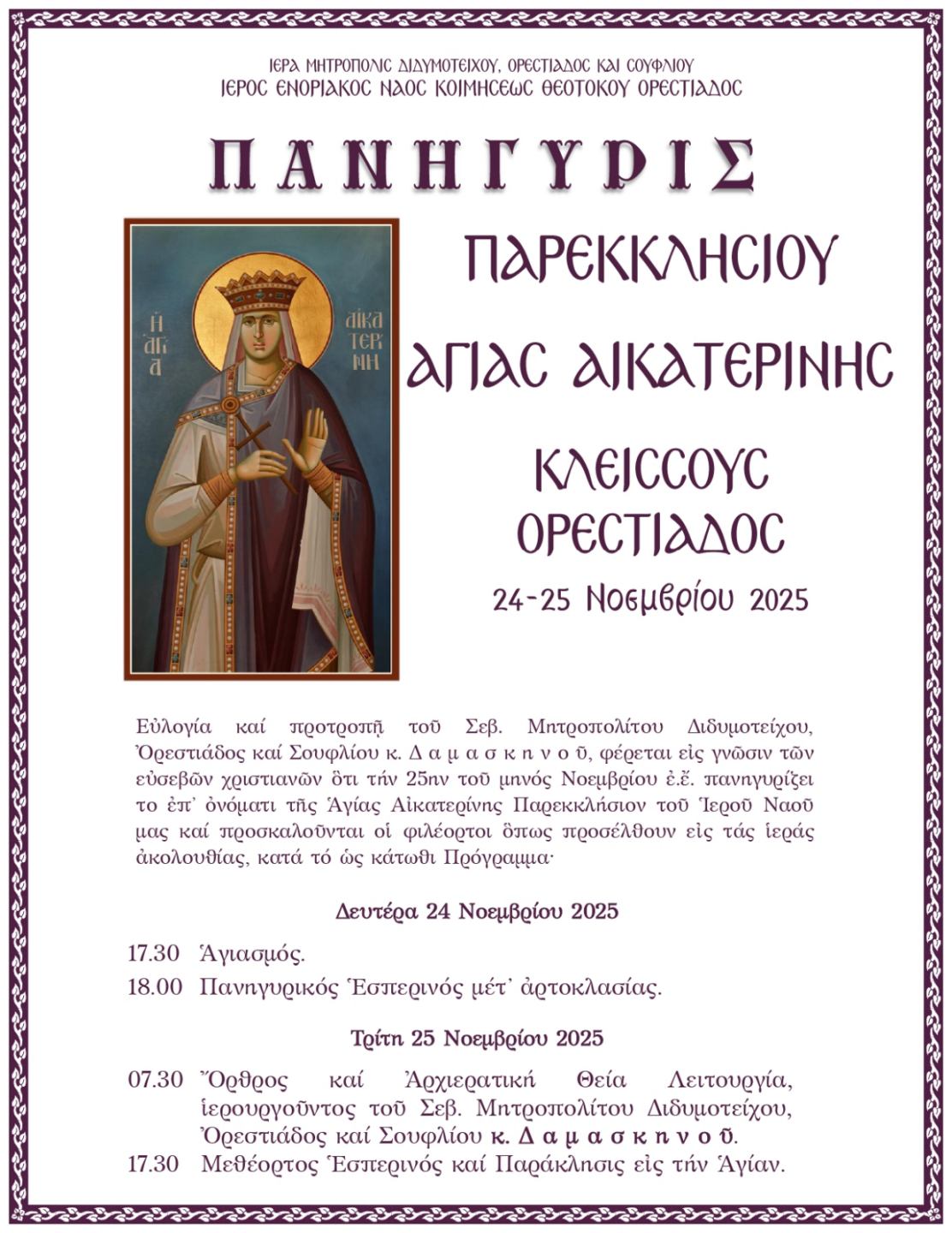 Η Αγία Αικατερίνη, «η πανεύφημος νύμφη του Χριστού» όπως την αποκαλεί ο Ιερός Ψαλμωδός [1], η πολιούχος του θεοβάδιστου Όρους Σινά, γεννήθηκε στην Αλεξάνδρεια το 294 μ.Χ. από ειδωλολατρική [2] οικογένεια και της έδωσαν το όνομα Δωροθέα. Η Αγία έζησε την εποχή την οποία αυτοκράτορας της Ρώμης ήταν ο Μαξιμίνος, ο οποίος ζητούσε από το λαό υπακοή στο πρόσωπό του και συμμετοχή σε ειδωλολατρικές θυσίες.