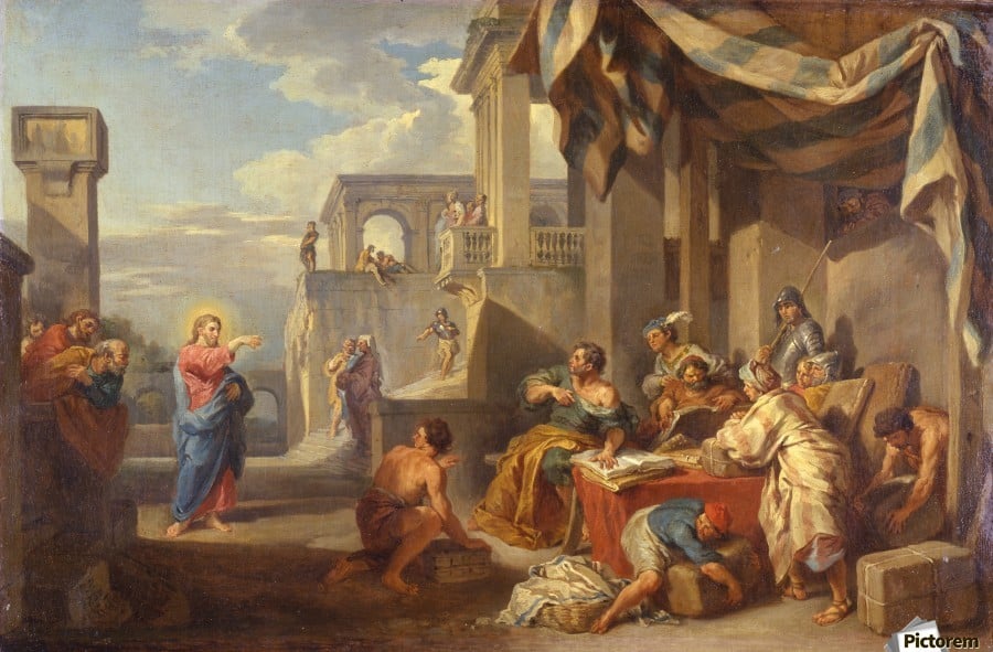 Τῷ καιρῷ ἐκείνῳ, παράγων ὁ Ἰησοῦς εἶδεν ἄνθρωπον καθήμενον ἐπὶ τὸ τελώνιον, Ματθαῖον λεγόμενον, καὶ λέγει αὐτῷ· ἀκολούθει μοι. καὶ ἀναστὰς ἠκολούθησεν αὐτῷ. Καὶ ἐγένετο αὐτοῦ ἀνακειμένου ἐν τῇ οἰκίᾳ, καὶ ἰδοὺ πολλοὶ τελῶναι καὶ ἁμαρτωλοὶ ἐλθόντες συνανέκειντο τῷ Ἰησοῦ καὶ τοῖς μαθηταῖς αὐτοῦ. καὶ ἰδόντες οἱ Φαρισαῖοι εἶπον τοῖς μαθηταῖς αὐτοῦ· διατί μετὰ τῶν τελωνῶν καὶ ἁμαρτωλῶν ἐσθίει ὁ διδάσκαλος ὑμῶν; ὁ δὲ Ἰησοῦς ἀκούσας εἶπεν αὐτοῖς· οὐ χρείαν ἔχουσιν οἱ ἰσχύοντες ἰατροῦ, ἀλλ᾿ οἱ κακῶς ἔχοντες. πορευθέντες δὲ μάθετε τί ἐστιν ἔλεον θέλω καὶ οὐ θυσίαν. οὐ γὰρ ἦλθον καλέσαι δικαίους, ἀλλὰ ἁμαρτωλοὺς εἰς μετάνοιαν.